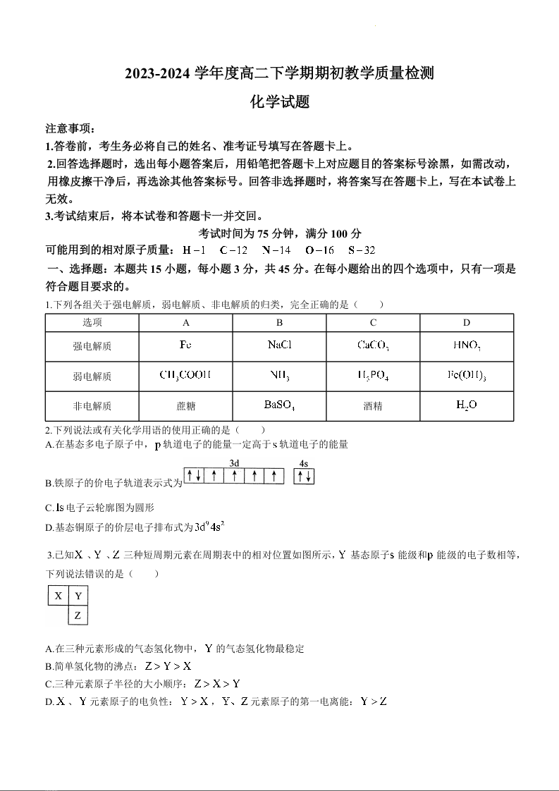 辽宁省2023-2024学年高二下学期开学考试化学+答案
