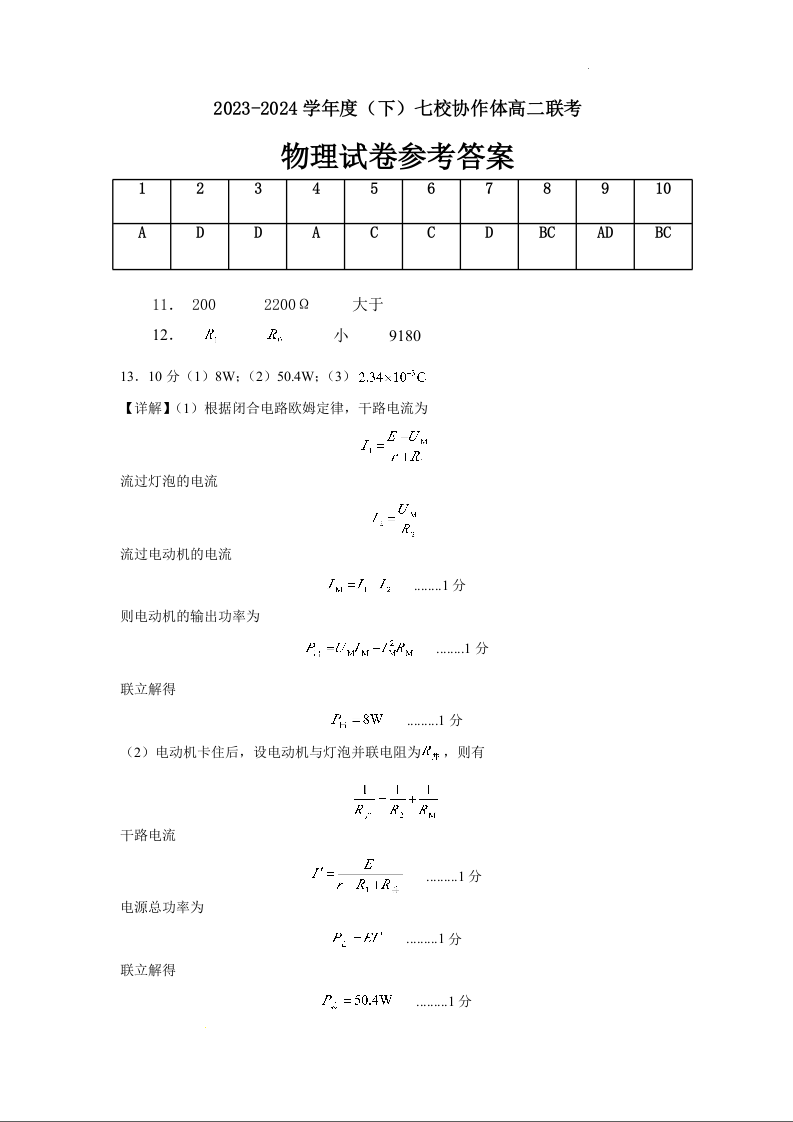 辽宁省七校协作体2023-2024学年高二下学期开学考试物理答案