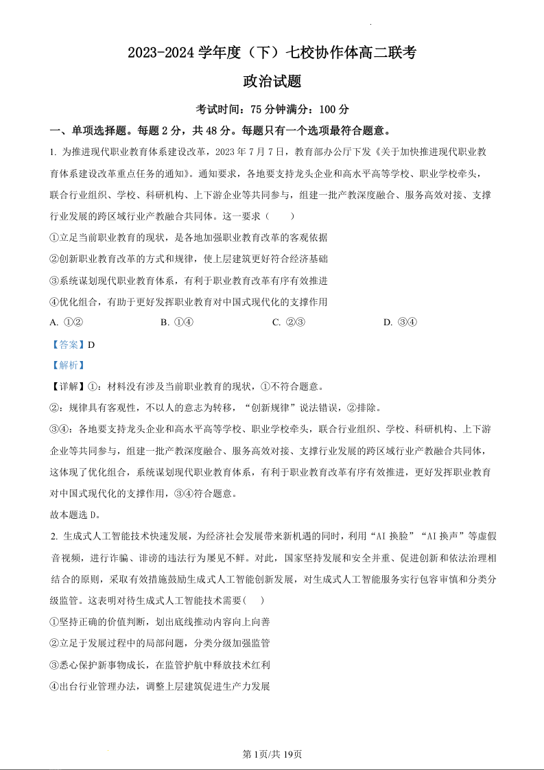 辽宁省七校协作体2023-2024学年高二下学期开学考试政治(精品解析版)