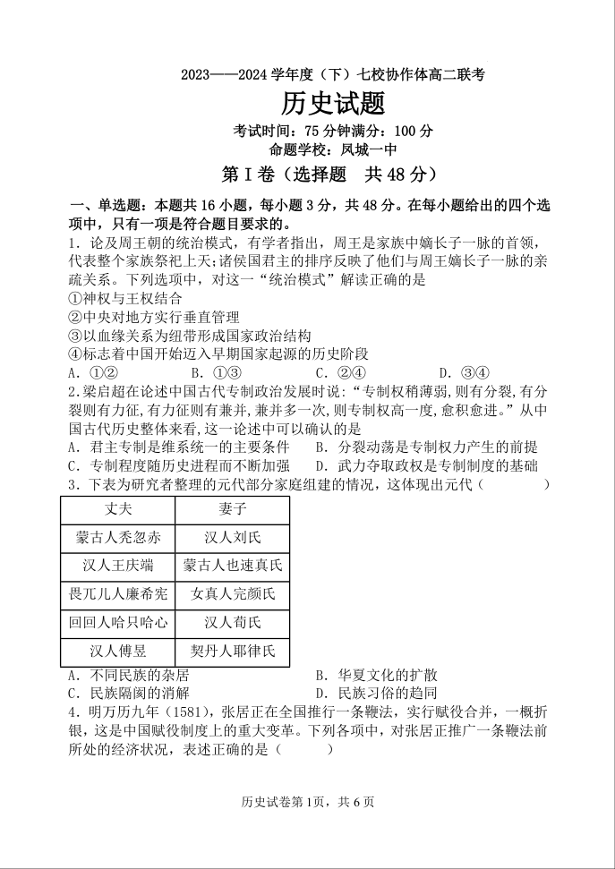 辽宁省七校协作体2023-2024学年高二下学期开学考试历史