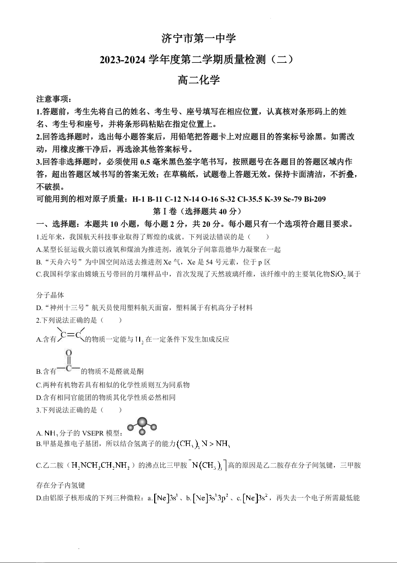 山东省济宁市第一中学2023-2024学年高二下学期3月月考化学