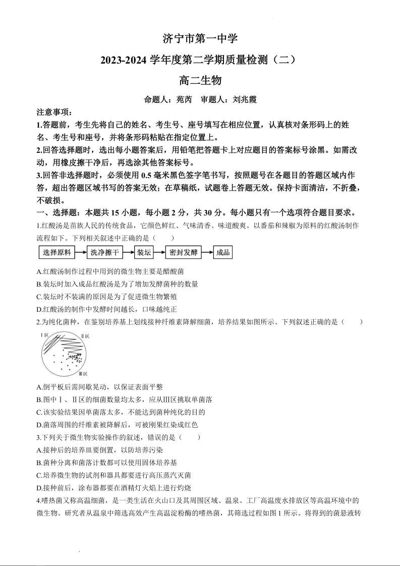 山东省济宁市第一中学2023-2024学年高二下学期3月月考生物