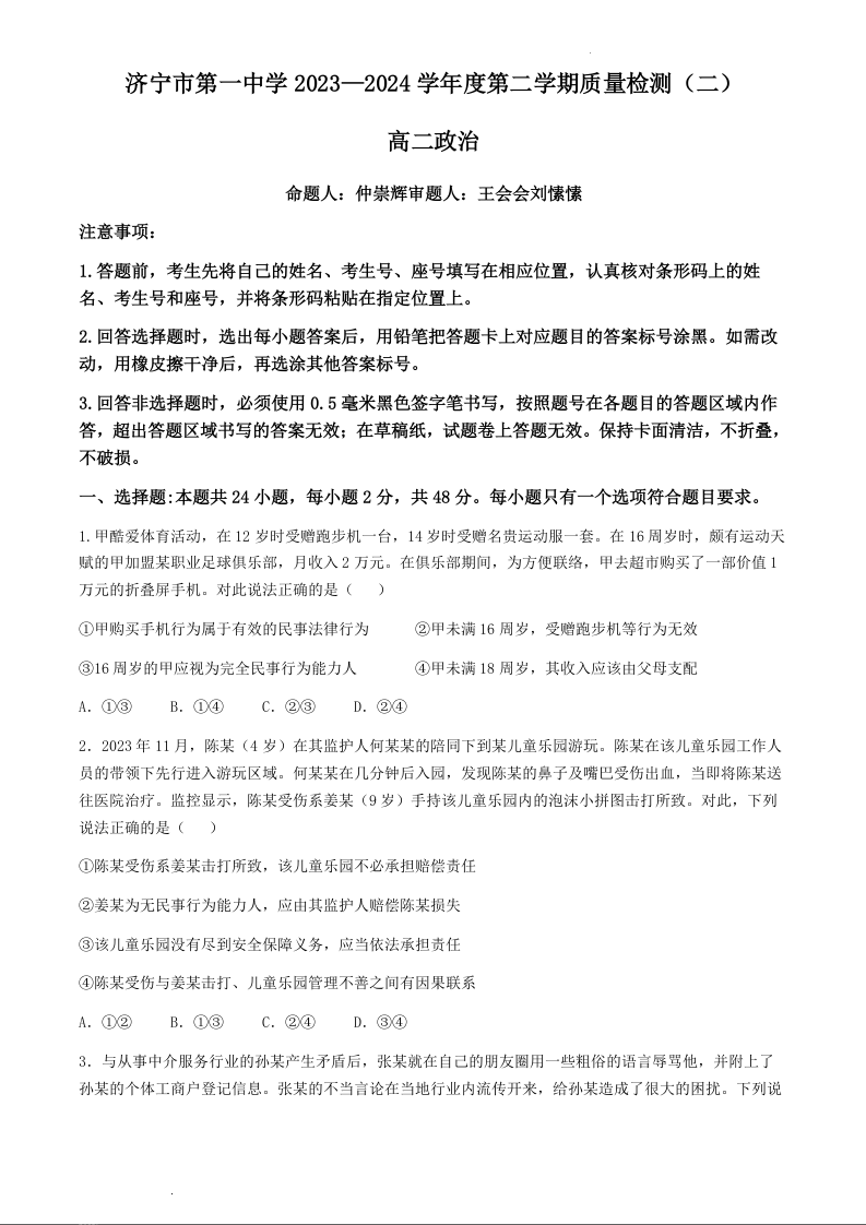 山东省济宁市第一中学2023-2024学年高二下学期3月月考政治