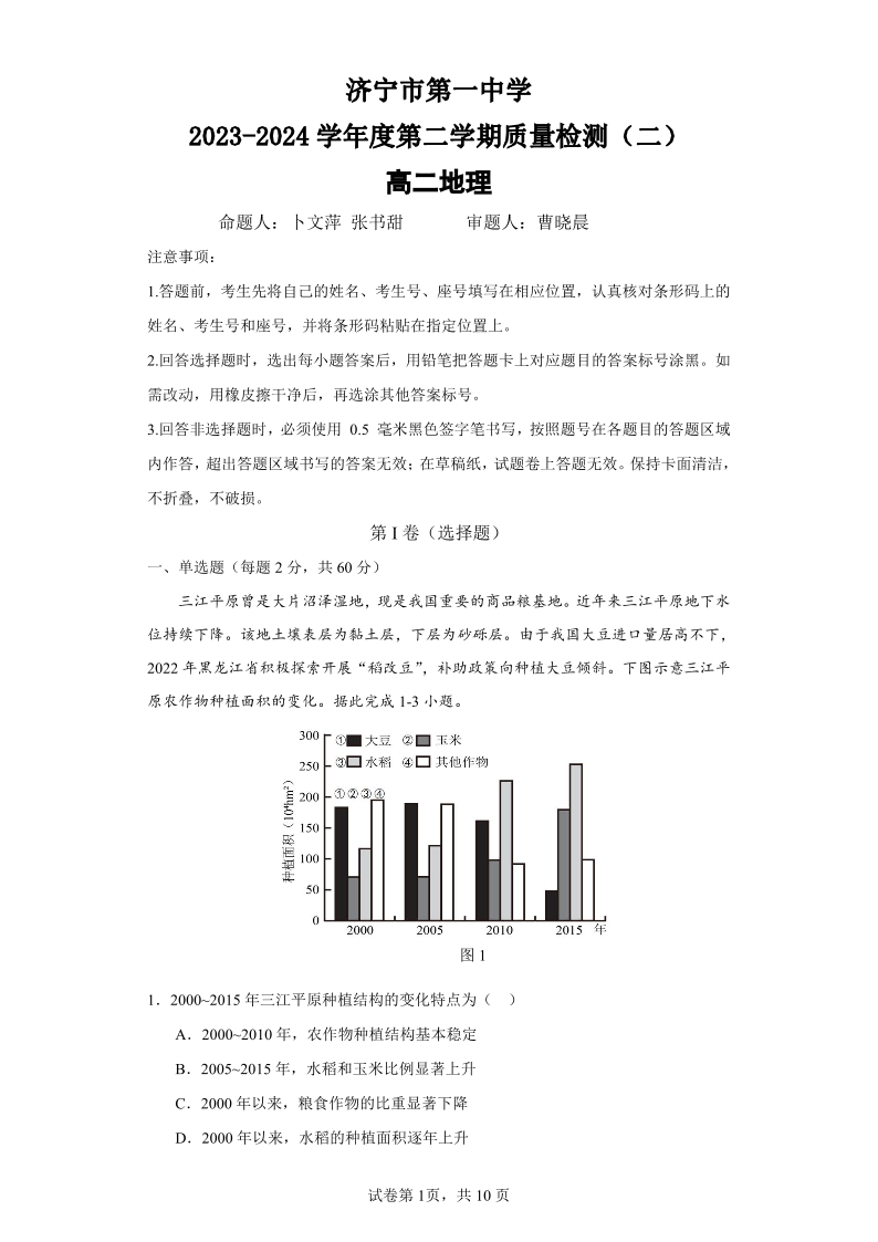 山东省济宁市第一中学2023-2024学年高二下学期3月月考地理