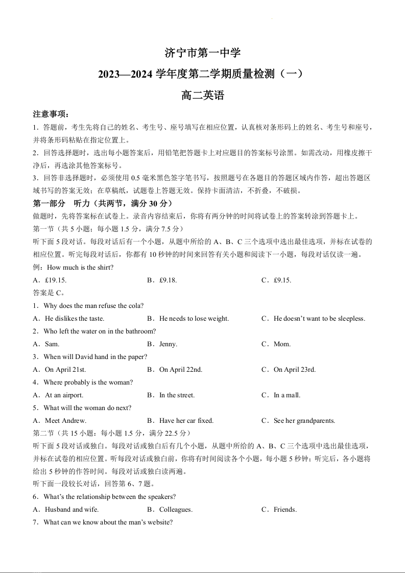 山东省济宁市第一中学2023-2024学年高二下学期开学考试英语+答案