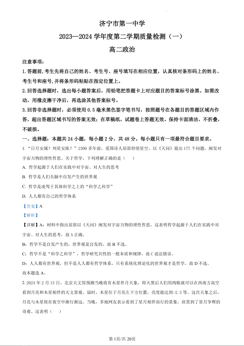 山东省济宁市第一中学2023-2024学年高二下学期开学考试政治(精品解析版)