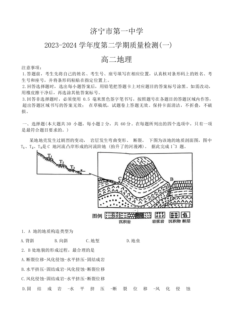 山东省济宁市第一中学2023-2024学年高二下学期开学考试地理