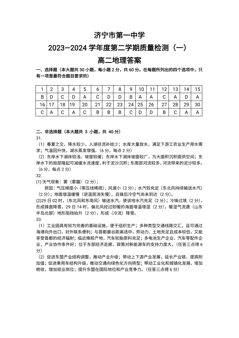 山东省济宁市第一中学2023-2024学年高二下学期开学考试地理答案