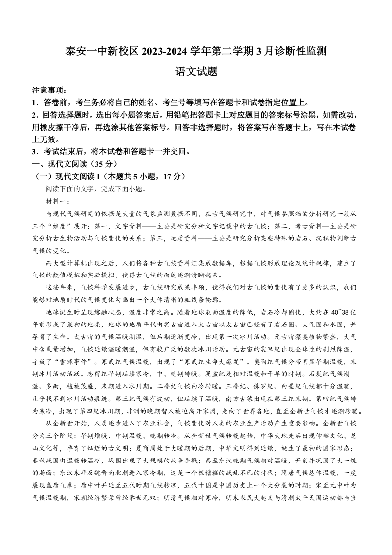山东省泰安市第一中学2023-2024学年高二下学期3月月考语文