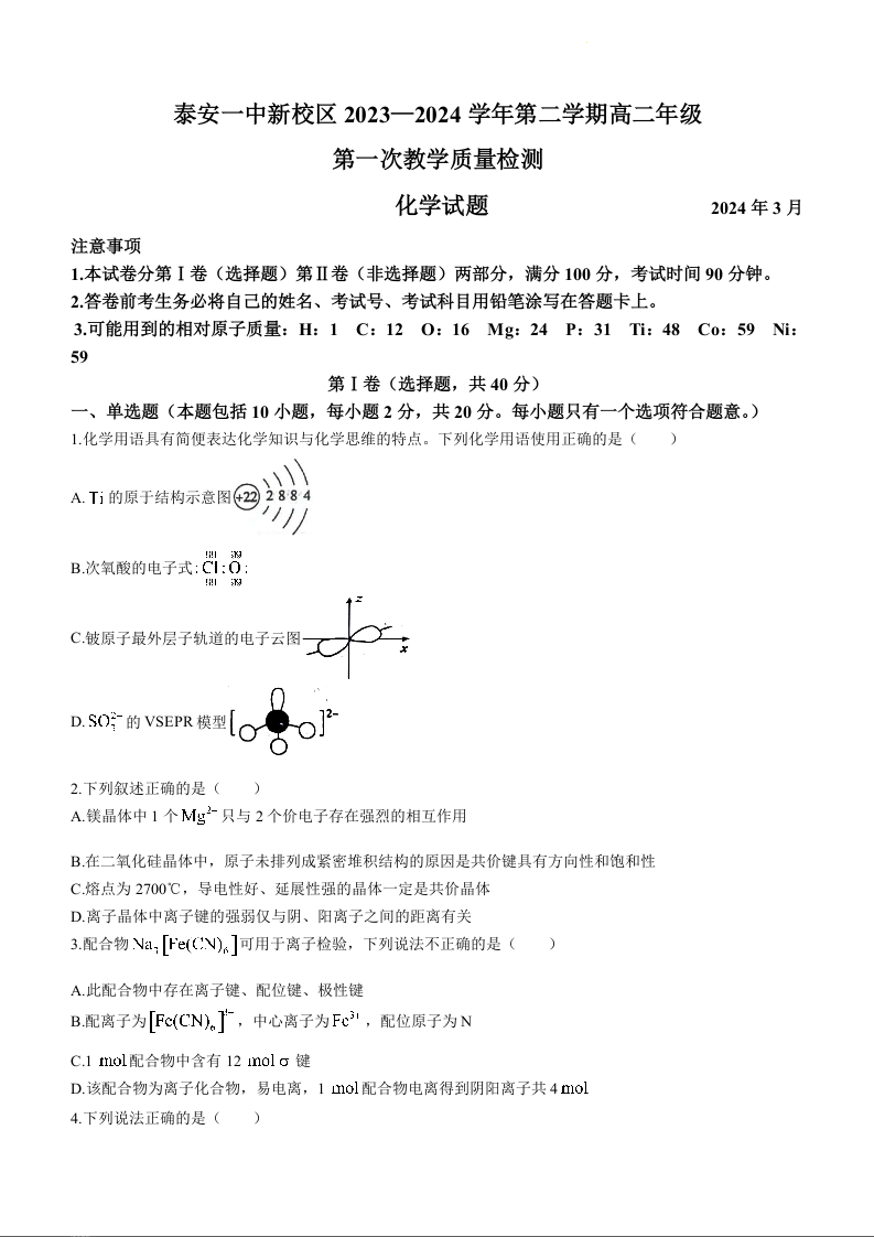 山东省泰安市第一中学2023-2024学年高二下学期3月月考化学