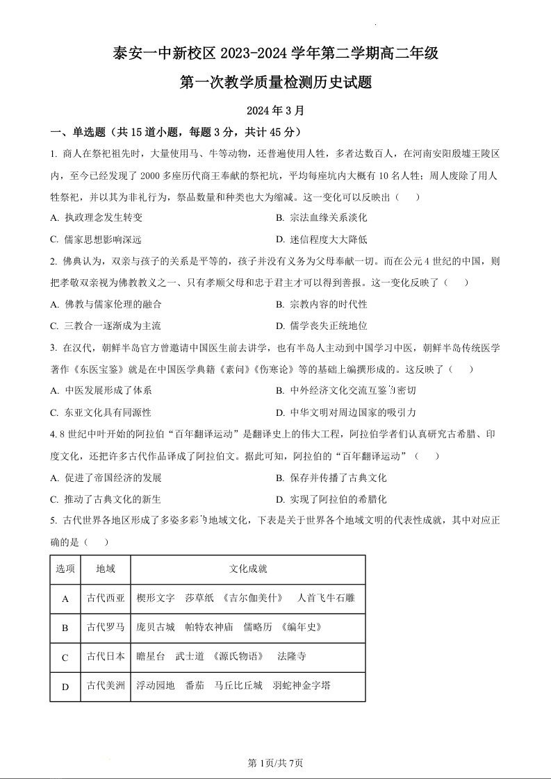 山东省泰安市第一中学2023-2024学年高二下学期3月月考历史(原卷版)