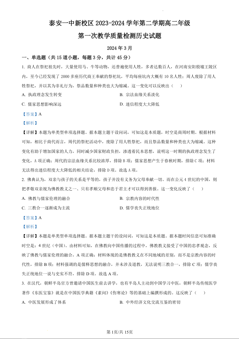 山东省泰安市第一中学2023-2024学年高二下学期3月月考历史(精品解析版)