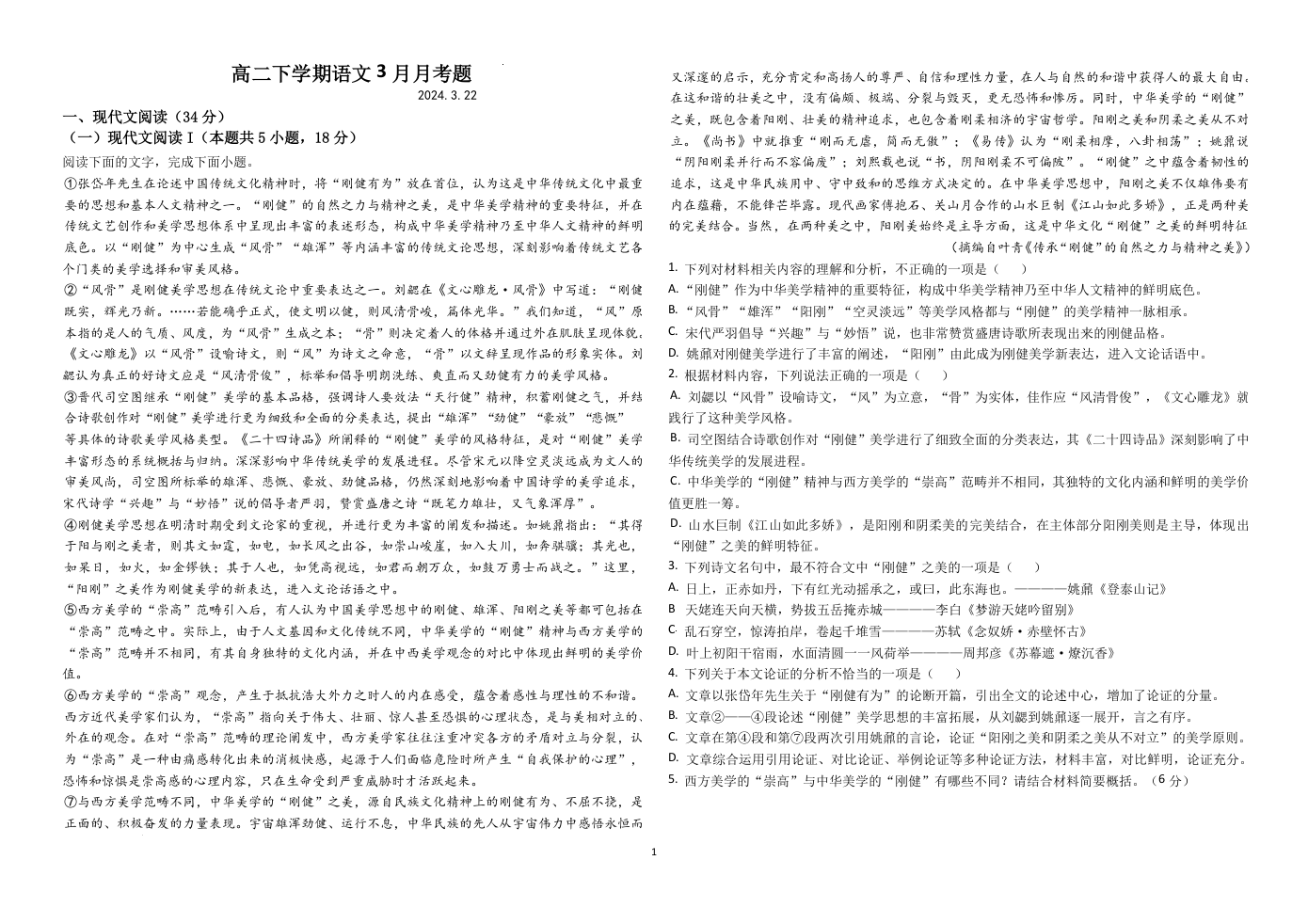 山东省潍坊市昌邑市第一中学2023-2024学年高二下学期第一次月考语文
