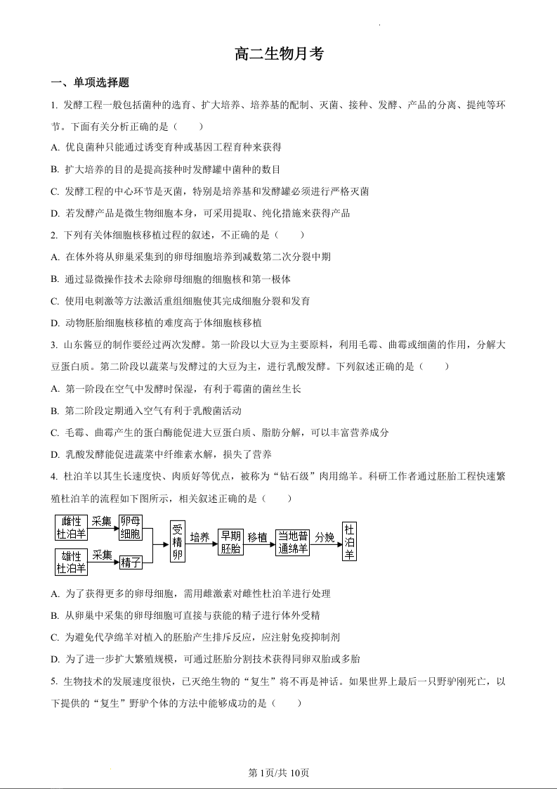 山东省潍坊市昌邑市第一中学2023-2024学年高二下学期第一次月考生物(原卷版)