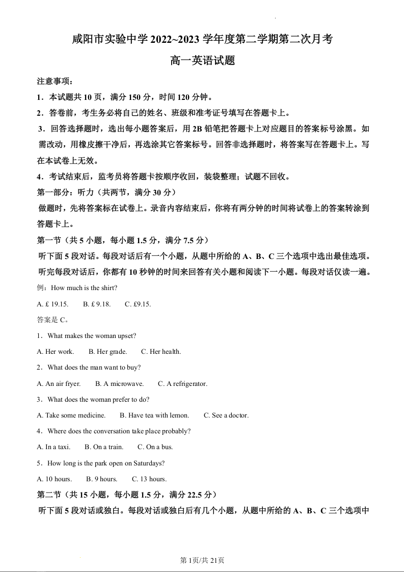 陕西省咸阳市实验中学2022-2023学年高二下学期第二次月考英语(精品解析版)