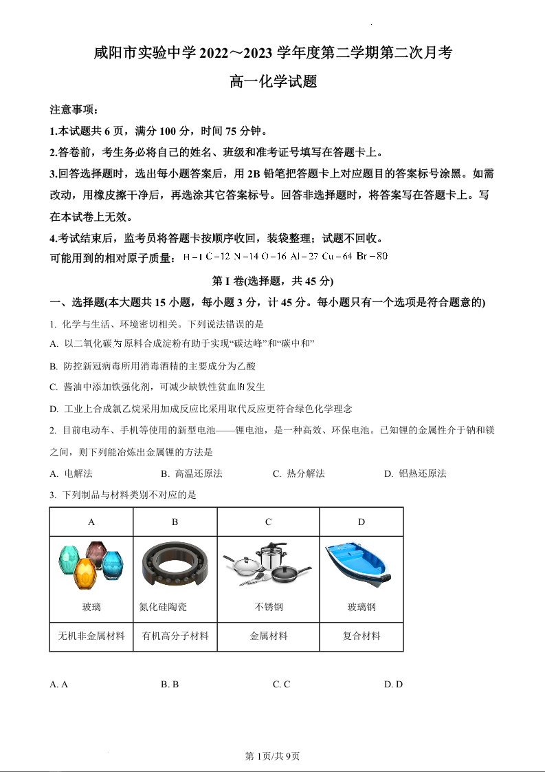 陕西省咸阳市实验中学2022-2023学年高二下学期第二次月考化学(原卷版)