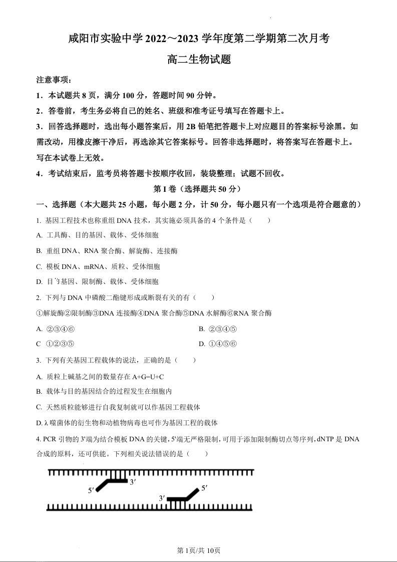 陕西省咸阳市实验中学2022-2023学年高二下学期第二次月考生物(原卷版)