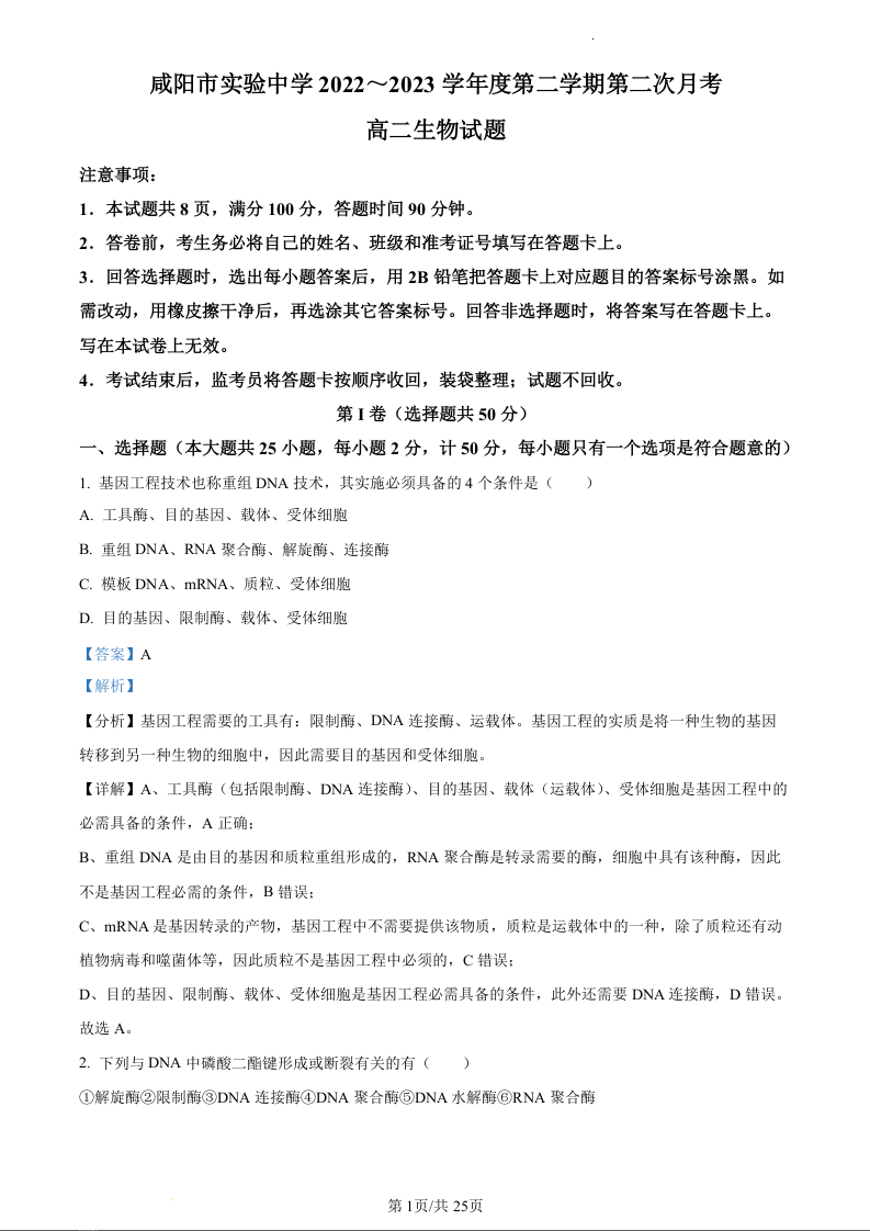 陕西省咸阳市实验中学2022-2023学年高二下学期第二次月考生物(精品解析版)