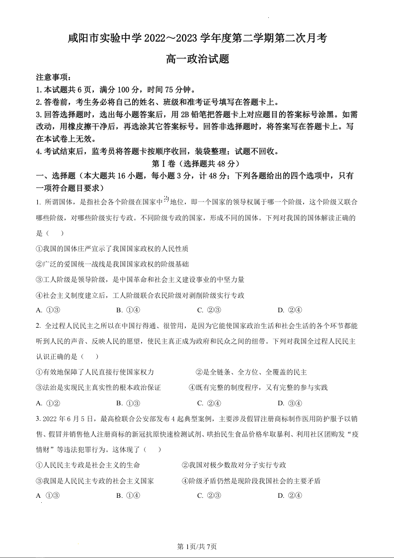 陕西省咸阳市实验中学2022-2023学年高二下学期第二次月考政治(原卷版)