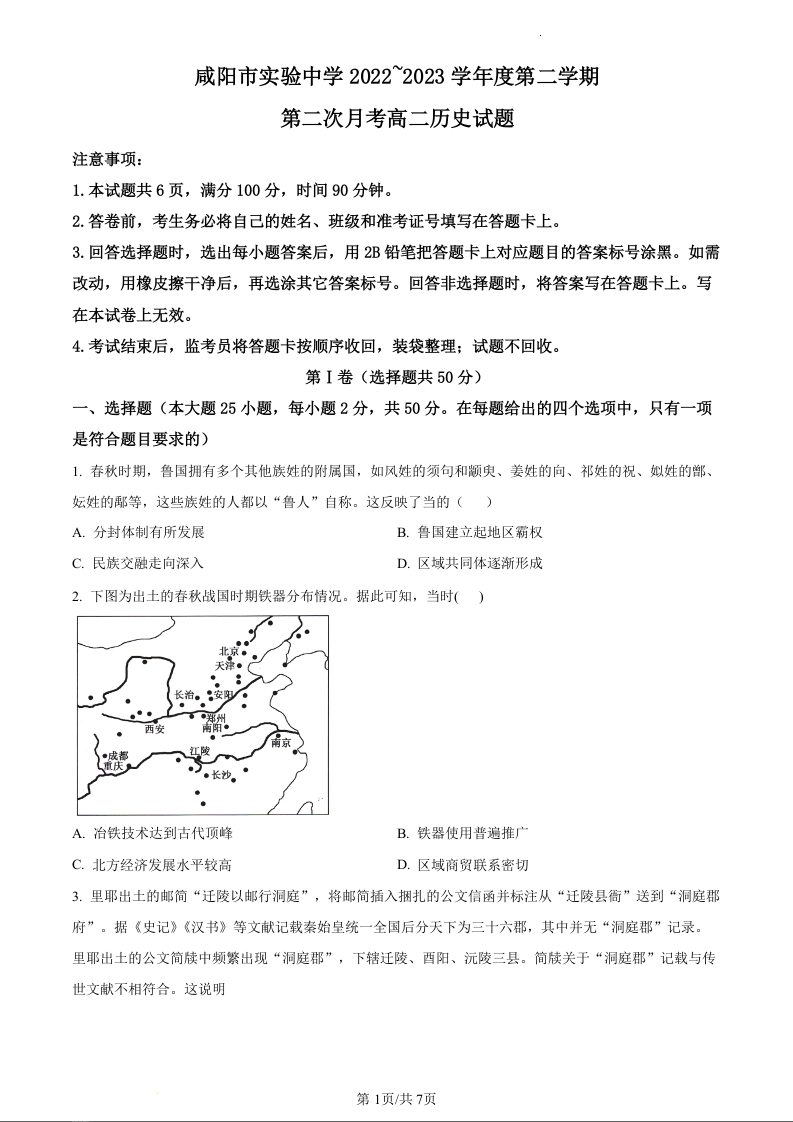 陕西省咸阳市实验中学2022-2023学年高二下学期第二次月考历史(原卷版)