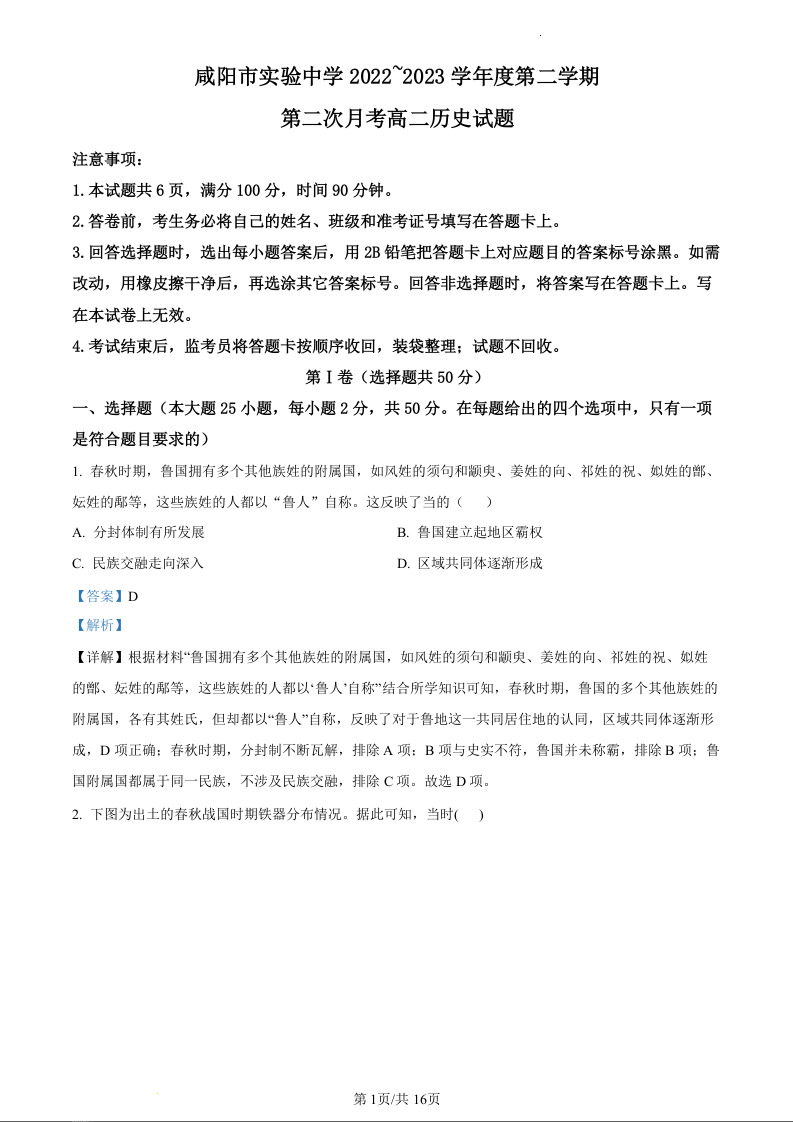 陕西省咸阳市实验中学2022-2023学年高二下学期第二次月考历史(精品解析版)