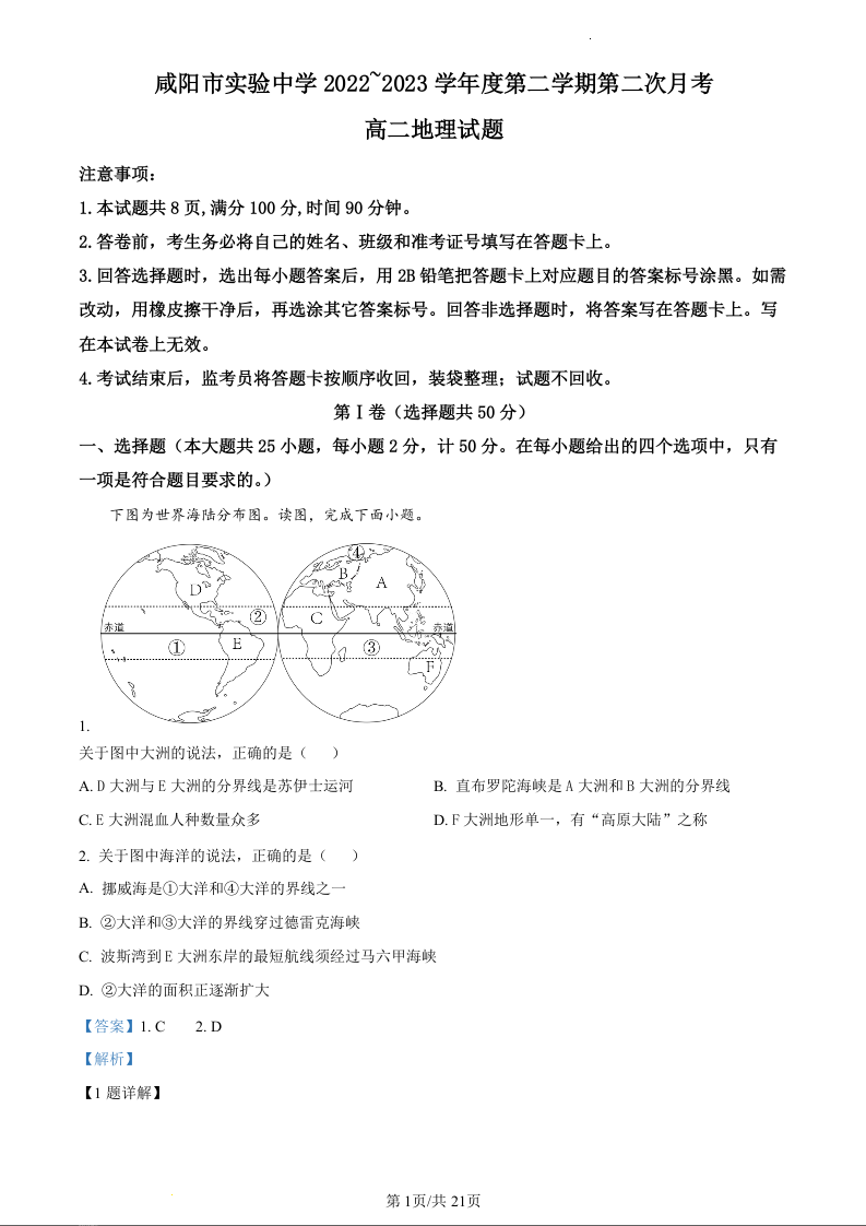 陕西省咸阳市实验中学2022-2023学年高二下学期第二次月考地理(精品解析版)