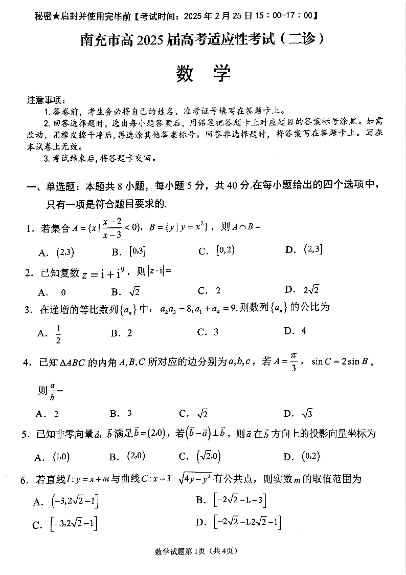 四川省南充市2024-2025学年高三第二次适应性考试(二模)数学