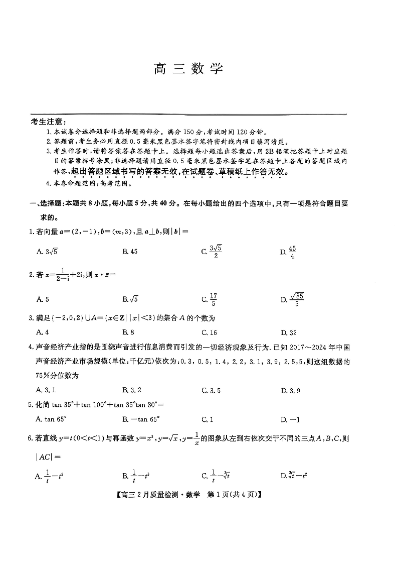 九师联盟2024-2025学年下学期2月高三质量检测数学