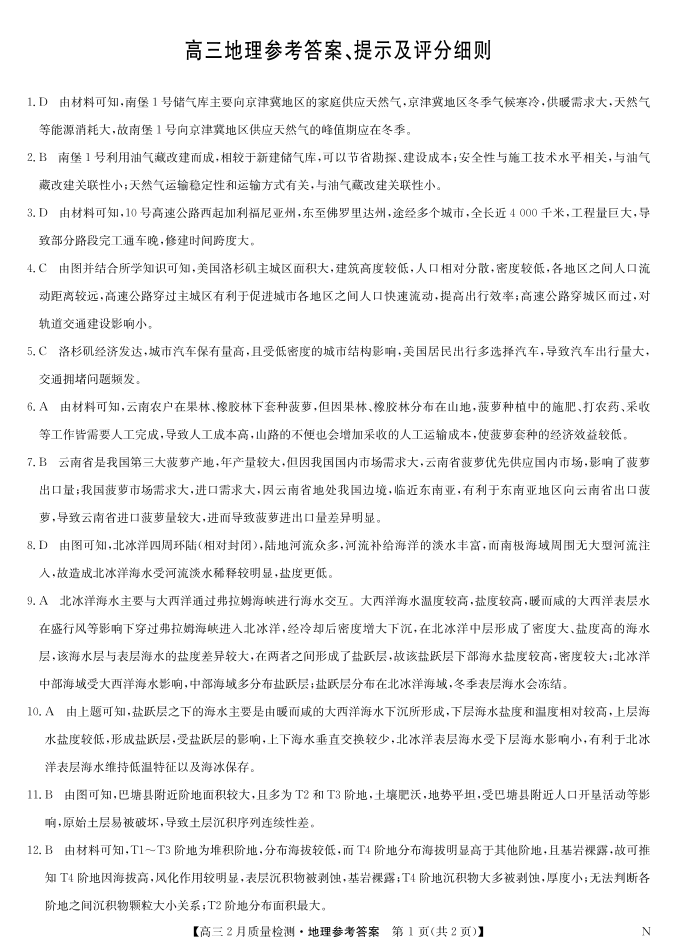 九师联盟2024-2025学年下学期2月高三质量检测地理答案