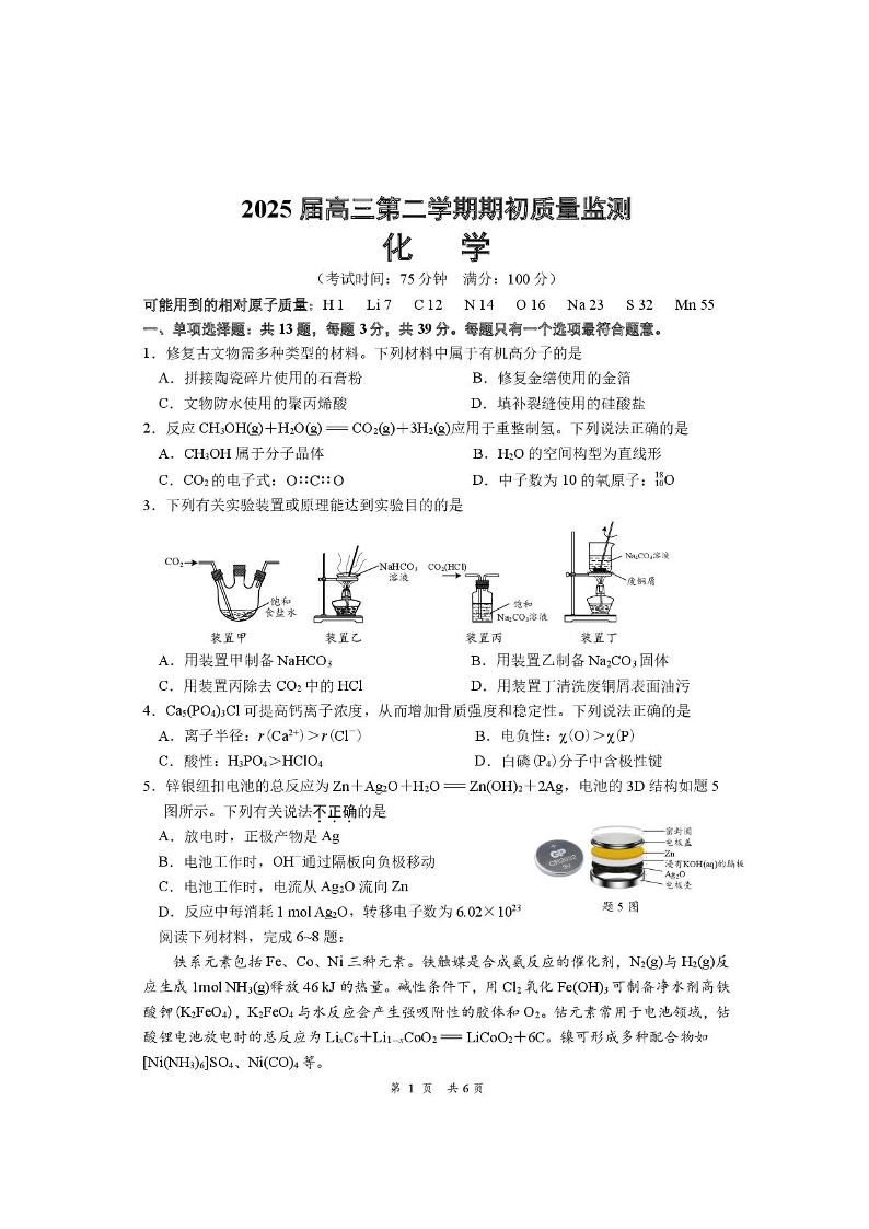 江苏省新高考基地学校2024-2025下学期期初高三质量监测化学+答案