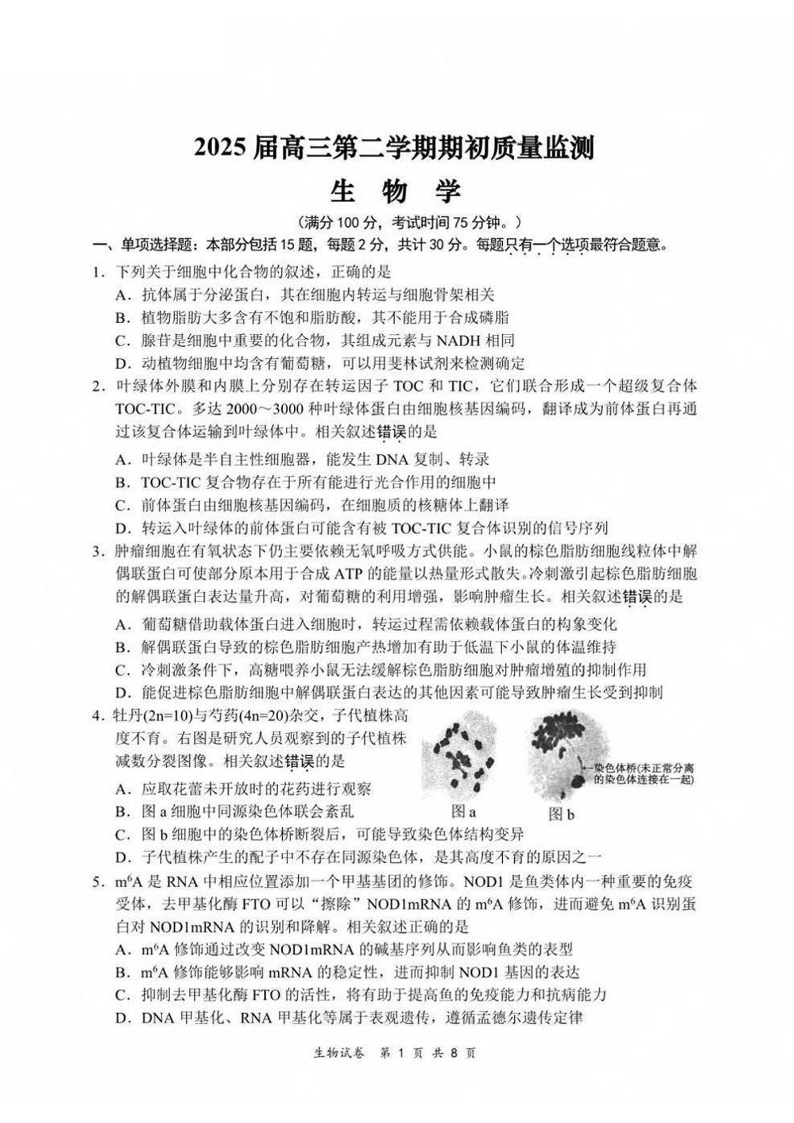 江苏省新高考基地学校2024-2025下学期期初高三质量监测生物+答案