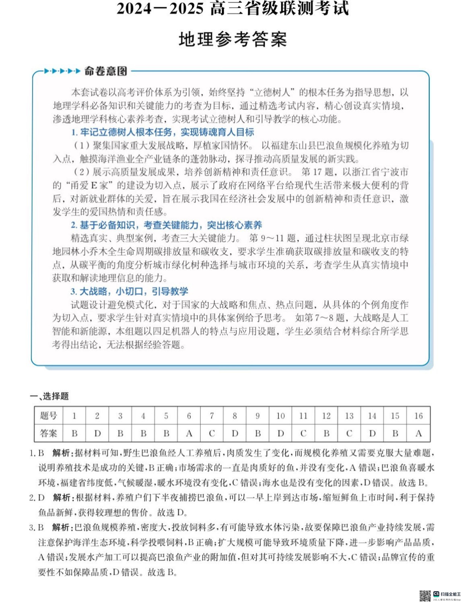 河北省2024-2025学年下学期2月高三省级联测考试(冲刺1)地理答案