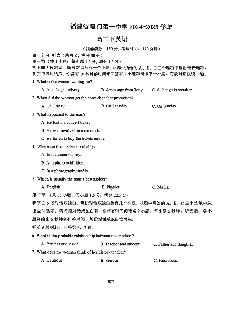 福建省厦门市一中2024-2025学年下学期高三第一次质检模拟英语+答案