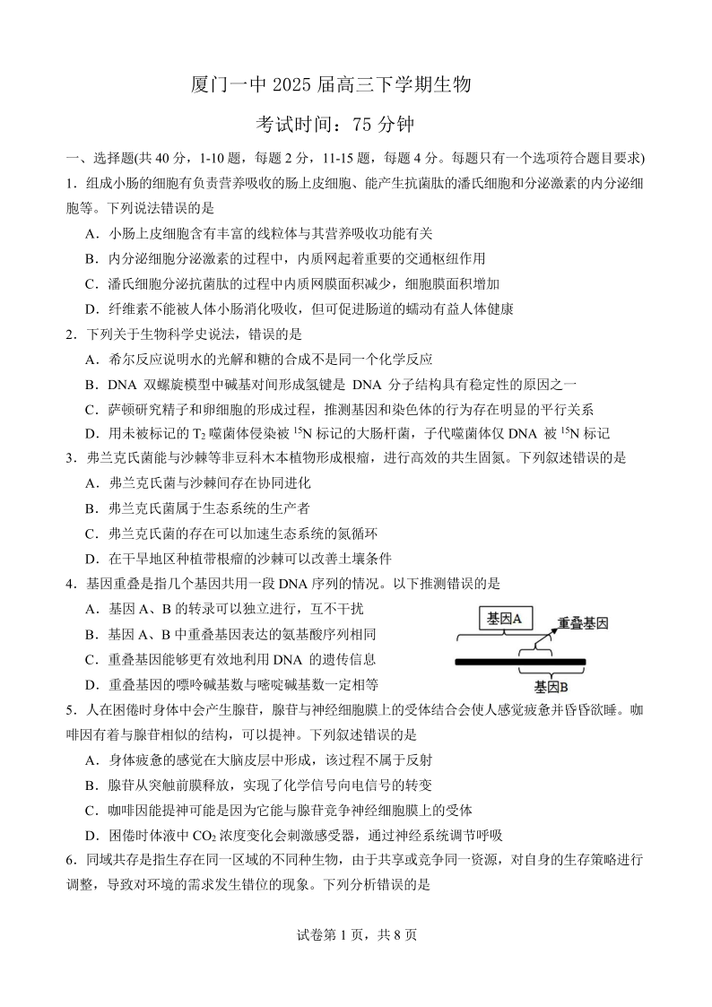 福建省厦门市一中2024-2025学年下学期高三第一次质检模拟生物+答案