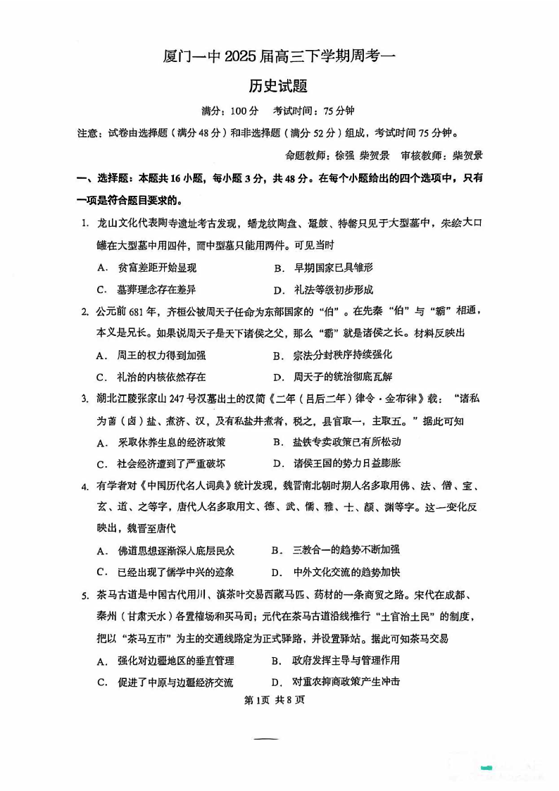 福建省厦门市一中2024-2025学年下学期高三第一次质检模拟历史+答案