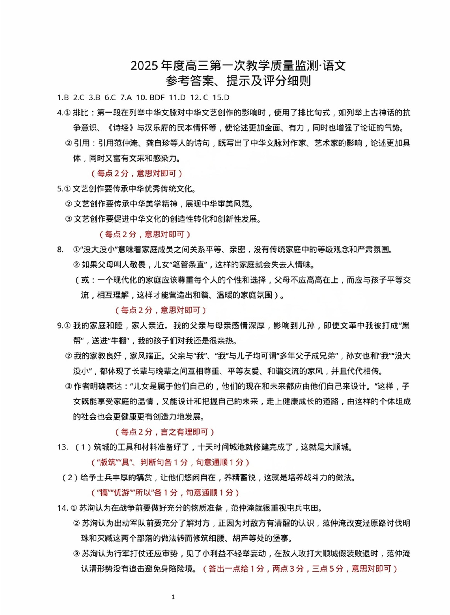 安徽省滁州市2024-2025学年下学期高三第一次教学质量检测语文答案