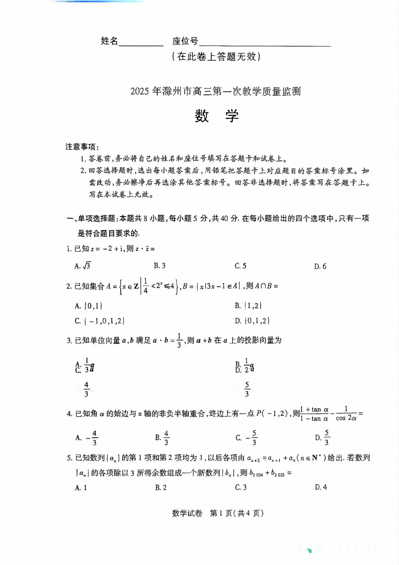 安徽省滁州市2024-2025学年下学期高三第一次教学质量检测数学+答案