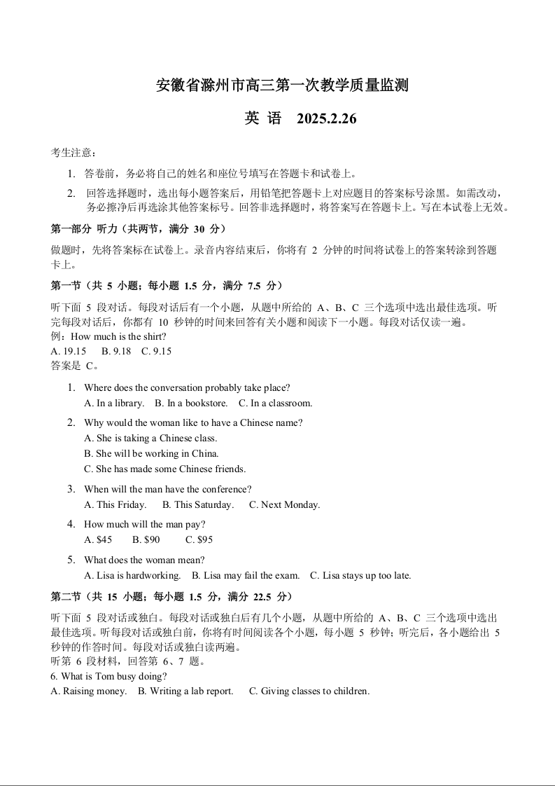 安徽省滁州市2024-2025学年下学期高三第一次教学质量检测英语