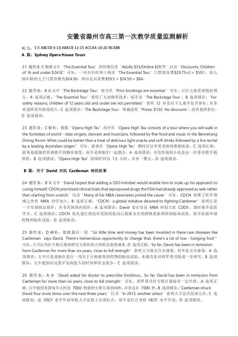 安徽省滁州市2024-2025学年下学期高三第一次教学质量检测英语答案