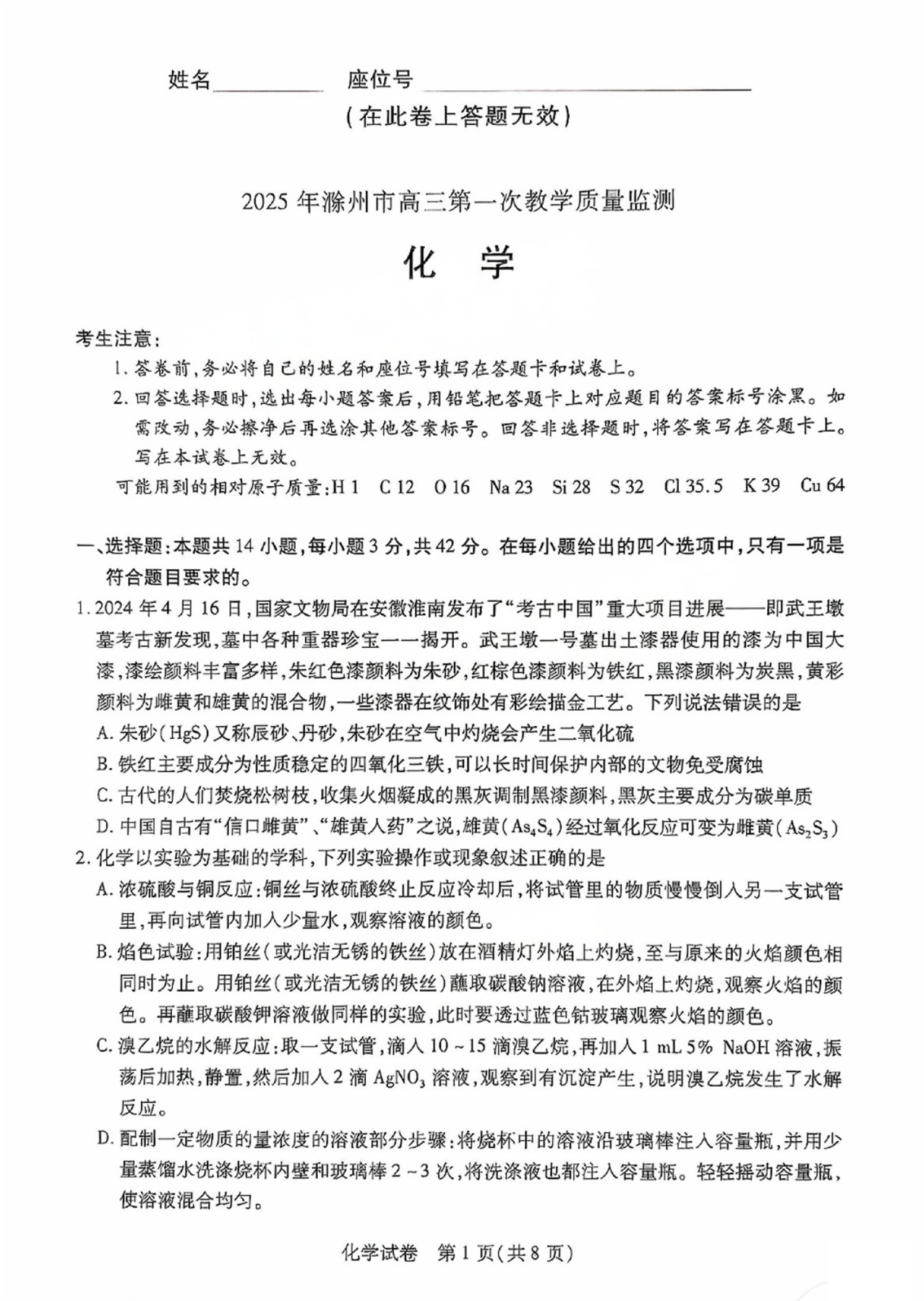 安徽省滁州市2024-2025学年下学期高三第一次教学质量检测化学