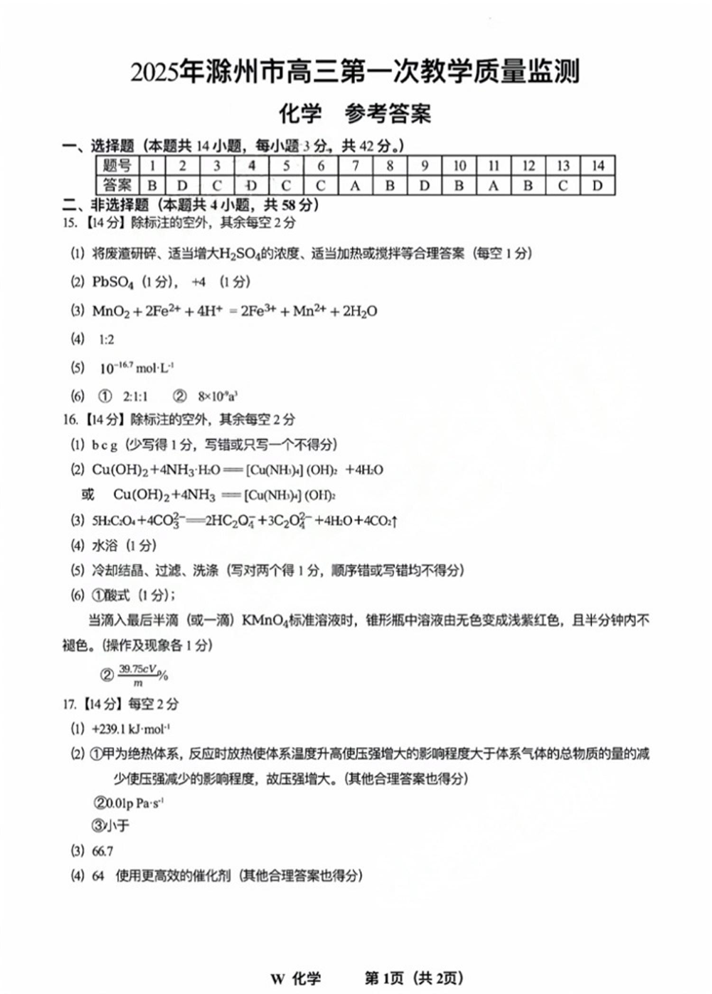 安徽省滁州市2024-2025学年下学期高三第一次教学质量检测化学答案