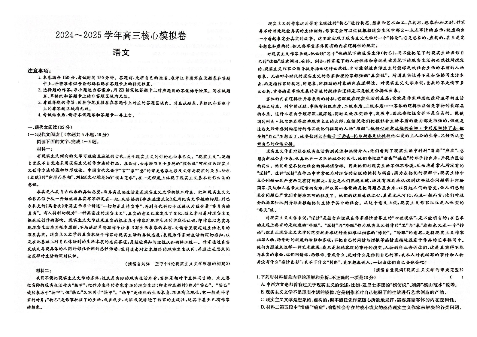 湖北省黄冈市2024-2025学年下学期2月高三核心模拟语文