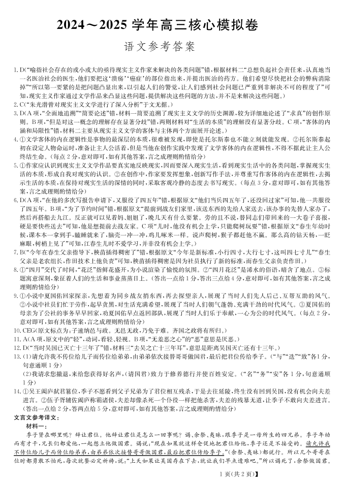 湖北省黄冈市2024-2025学年下学期2月高三核心模拟语文答案
