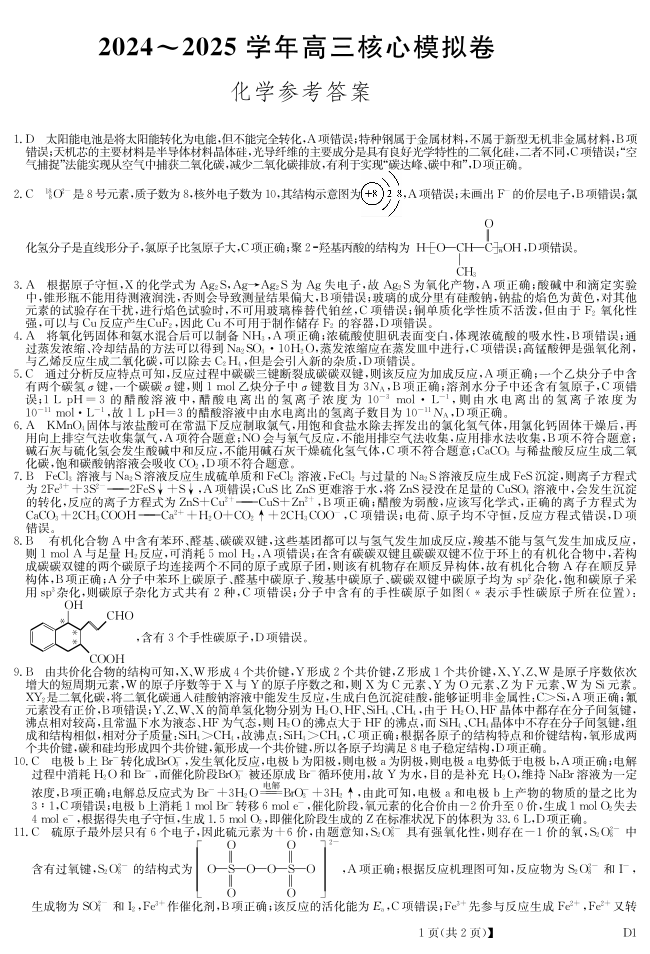 湖北省黄冈市2024-2025学年下学期2月高三核心模拟化学答案