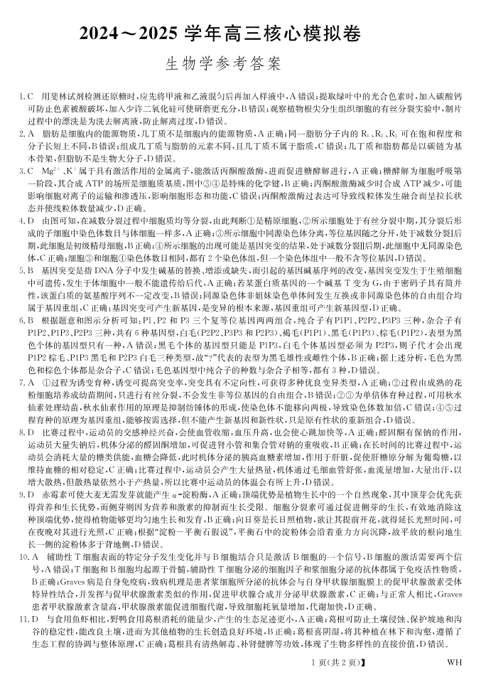 湖北省黄冈市2024-2025学年下学期2月高三核心模拟生物答案