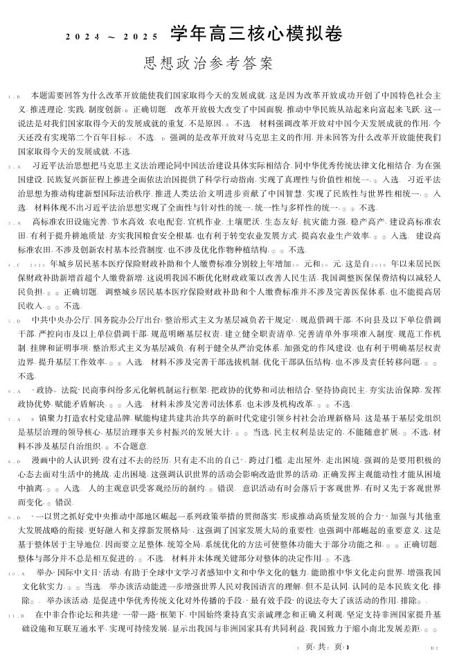 湖北省黄冈市2024-2025学年下学期2月高三核心模拟政治答案