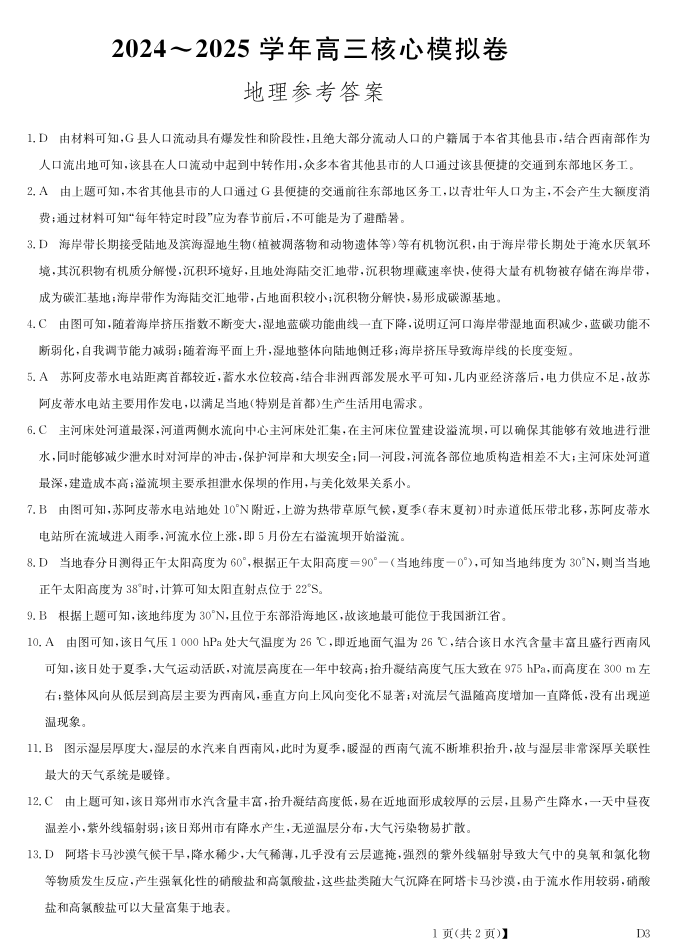 湖北省黄冈市2024-2025学年下学期2月高三核心模拟地理答案