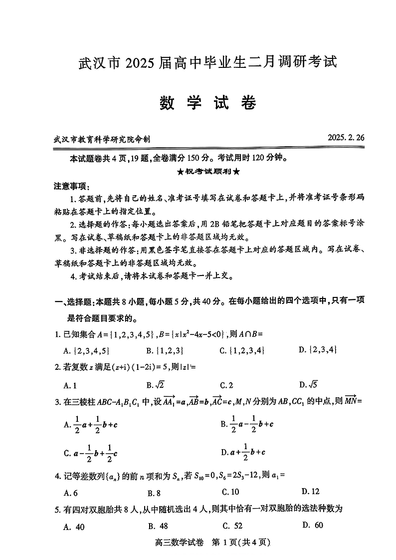 湖北省武汉市2024-2025学年下学期高中毕业生二月调研考试数学