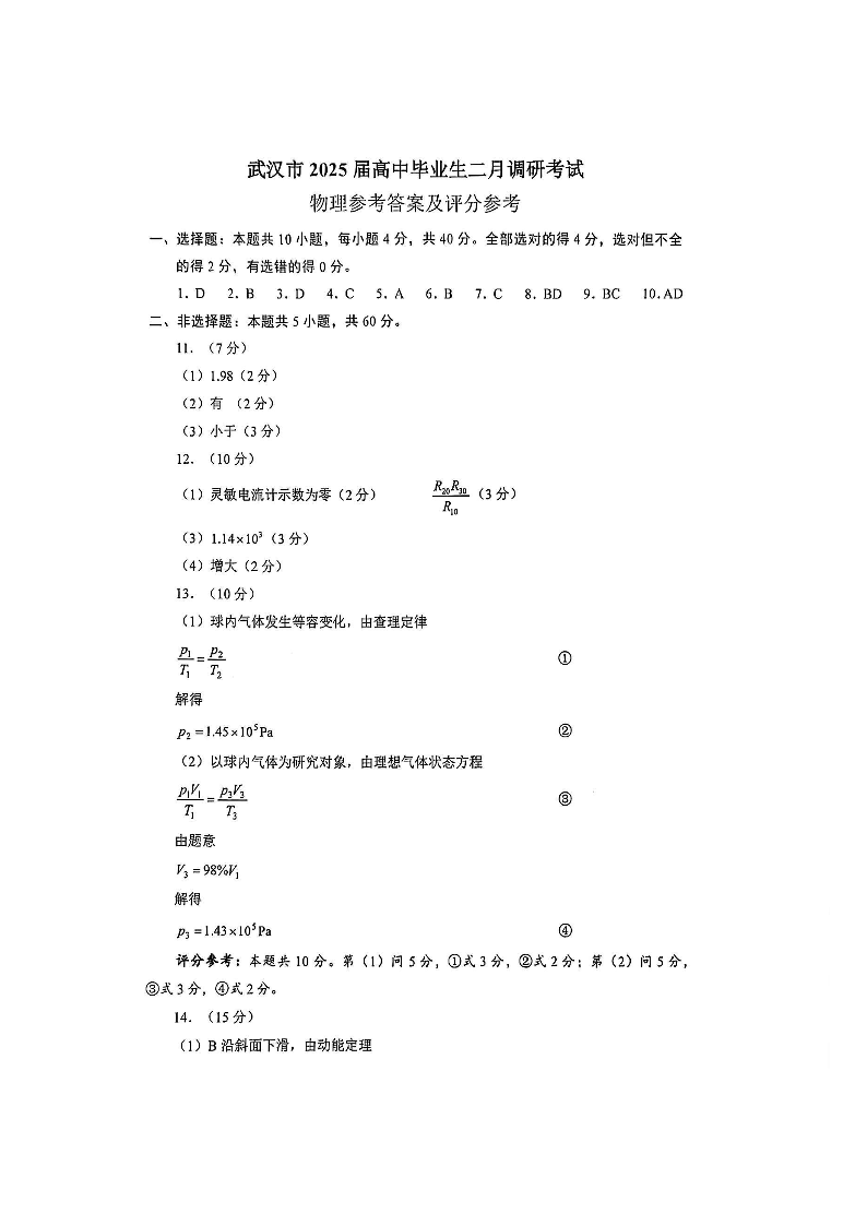 湖北省武汉市2024-2025学年下学期高中毕业生二月调研考试物理答案