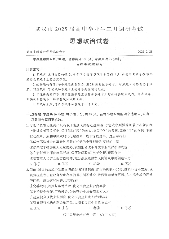 湖北省武汉市2024-2025学年下学期高中毕业生二月调研考试政治